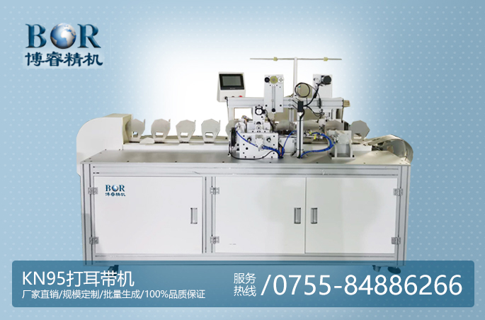 本機采用鋁合金材料,外觀美觀大方。PLC微電腦控制,具有折疊型口罩本體(片體)輸送系統和耳帶旋轉熔接系統,邊帶控制系統和出料系統,焊接效率高,耳帶焊接位置美觀。